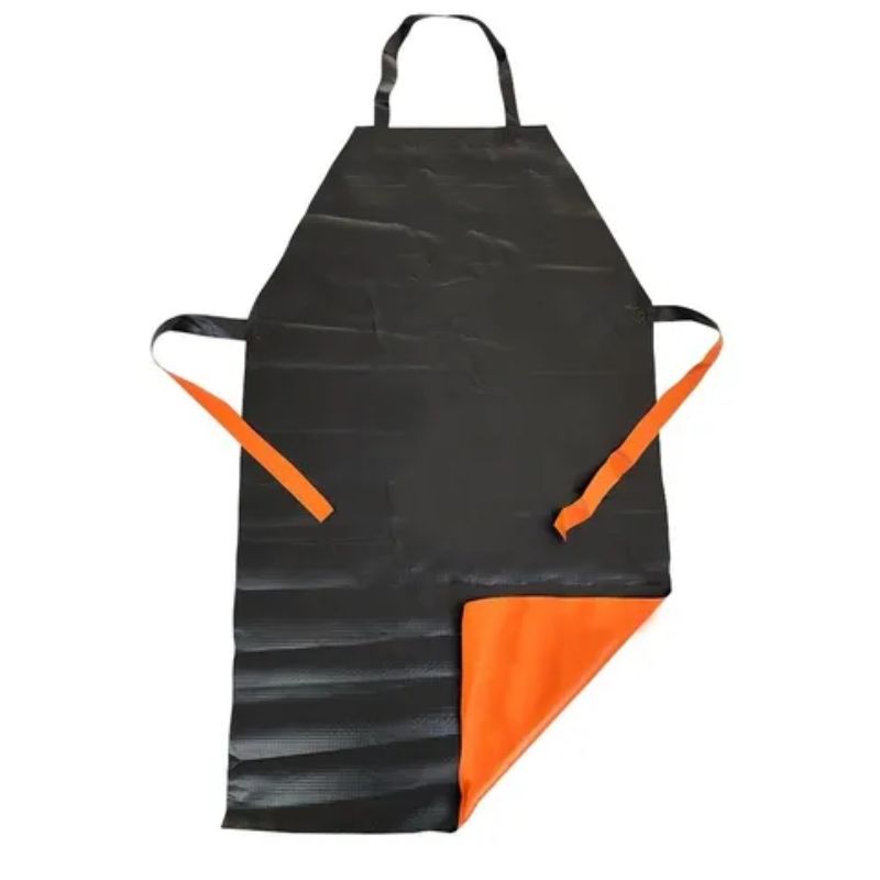 AVENTAL DE SEGURANÇA CONFECCIONADO EM TREVIRA KP500 LARANJA E PRETO, REFORÇADO COM POLIÉSTER REVESTIDO DE PVC EM AMBAS AS FACES; POSSUI TIRAS DO MESMO MATERIAL COSTURADAS ATRAVÉS DE SOLDA ELETRÔNICA.