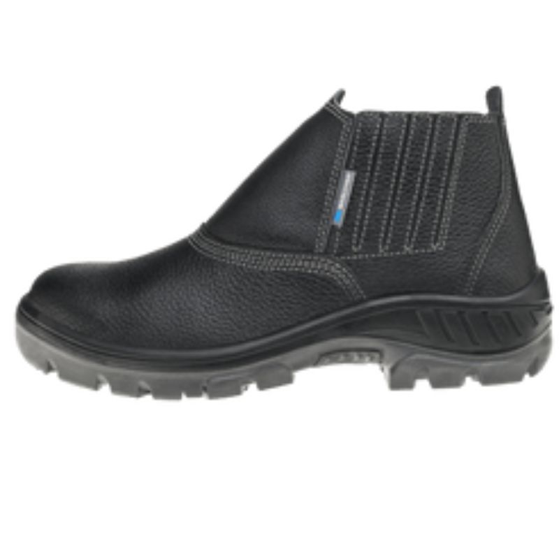 Calçado de segurança tipo botina, fechamento em elástico nas laterais, confeccionado em couro na cor preta curtido ao cromo, palmilha de montagem em nãotecido resinado fixada pelo sistema strobel, forro interno em nãotecido, solado de poliuretano bidensidade injetado diretamente no cabedal, biqueira de aço, resistente à absorção de energia no salto e ao óleo combustível.