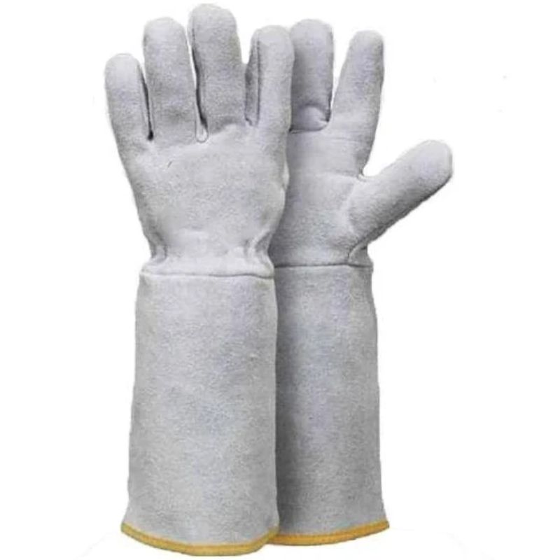 Luva de segurança confeccionada em raspa, reforço interno em raspa na palma e face palmar dos dedos, tira de reforço externo em raspa entre os dedos polegar e indicador, modelo Petroleira, punhos 20 cm.