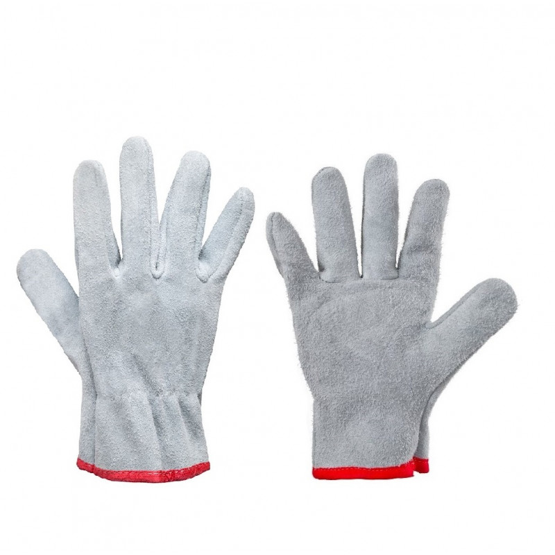 Luva de segurança confeccionada em raspa reforço interno na palma reforço externo de costura nos dedos polegar, anelar e médio elástico no dorso.