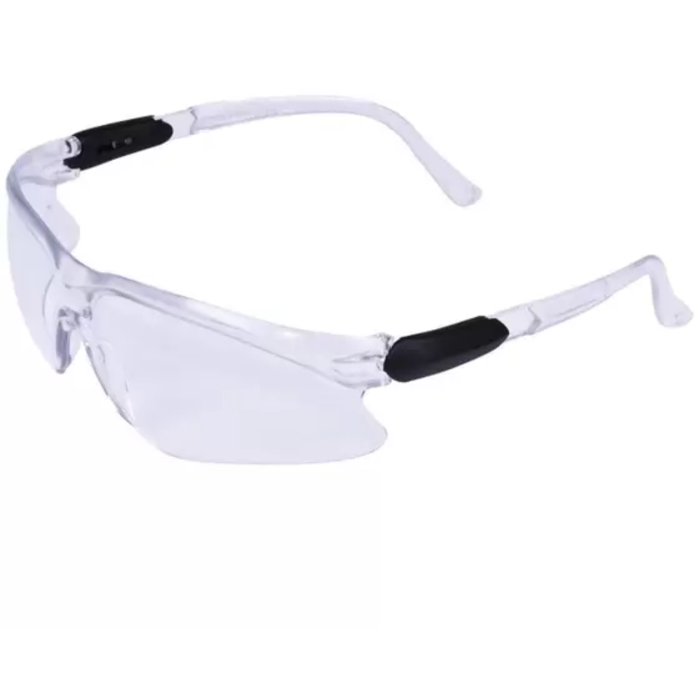 Óculos de segurança constituído de armação e visor confeccionados em uma única peça de policarbonato, com apoio nasal confeccionado do mesmo material e injetados na mesma peça. As hastes são constituídas de duas peças: semi-haste vazada confeccionada em náilon com uma das extremidades xadas ao visor por meio de parafuso metálico e semi-haste confeccionada do mesmo material do visor que se encaixa na semi-haste anterior e permite o ajuste do tamanho.
