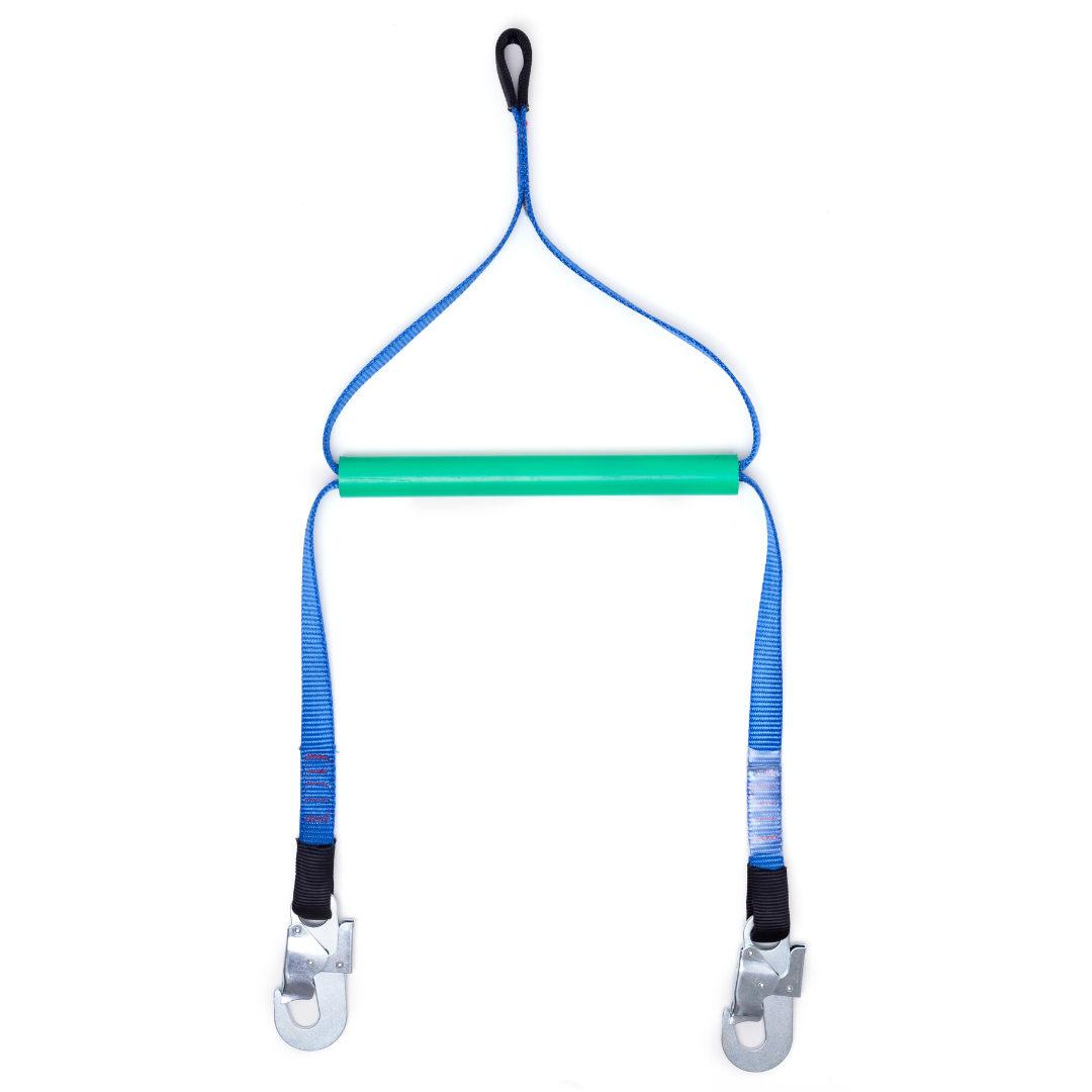 Trapézio para resgate em espaço confinado, possui um olhal em poliéster, revestido com fita tubular de 30 mm em poliéster para ancoragem e dois ganchos de 17 mm em aço, distanciador de 300 mm em pvc reforçado.