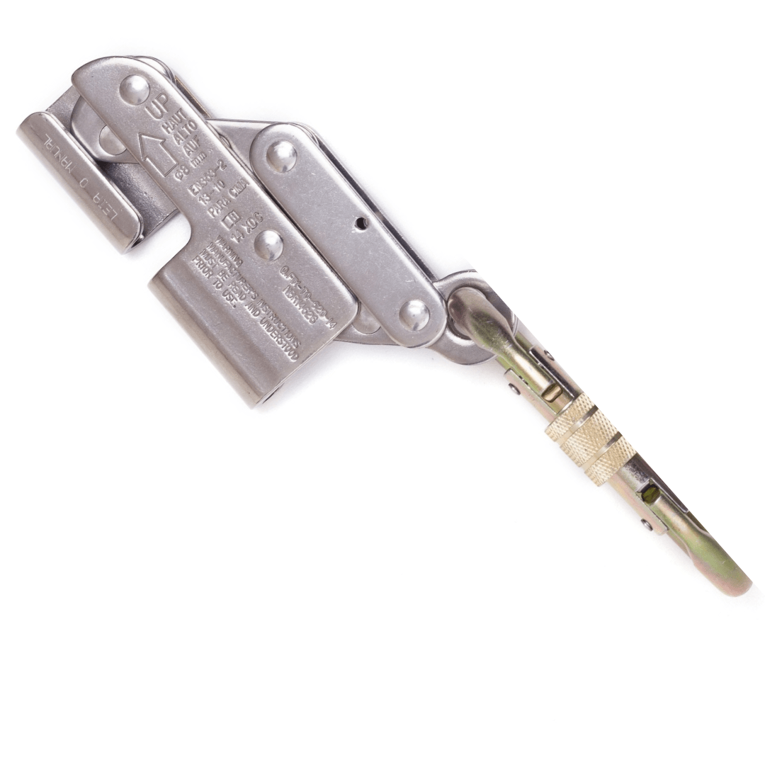 Dispositivo Trava Quedas para cabo de aço 8 mm, com mosquetão oval com abertura de 18 mm, utilizado no ponto de conexão peitoral do cinturão tipo paraquedista/abdominal.